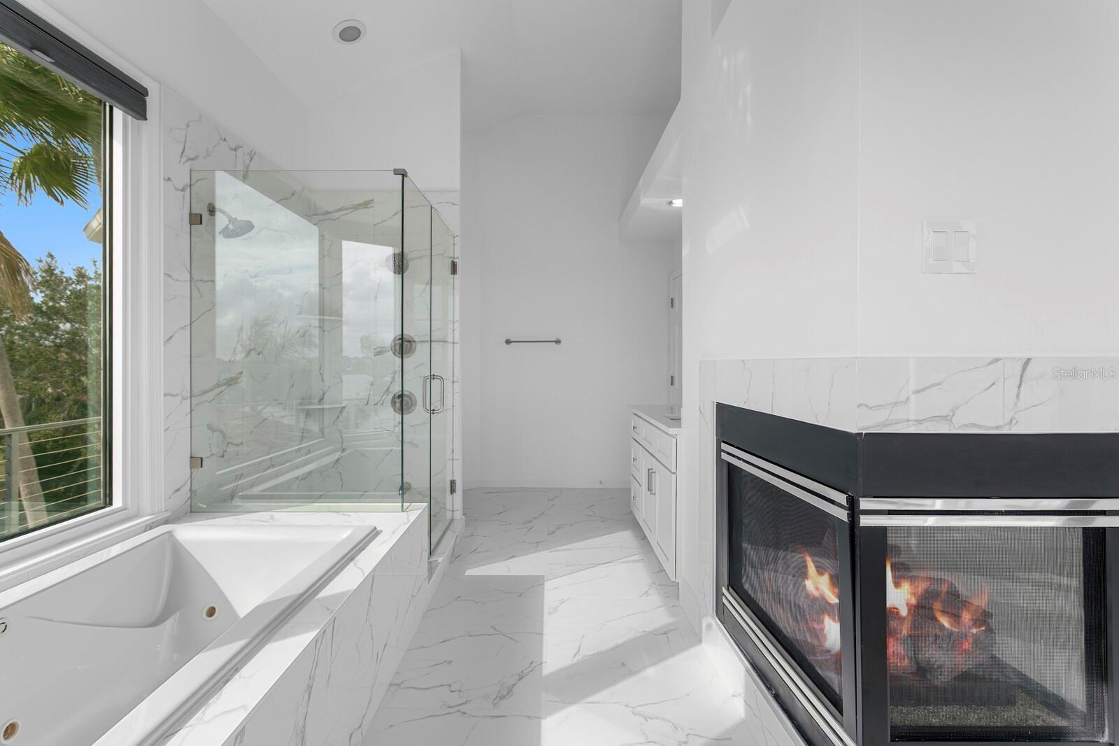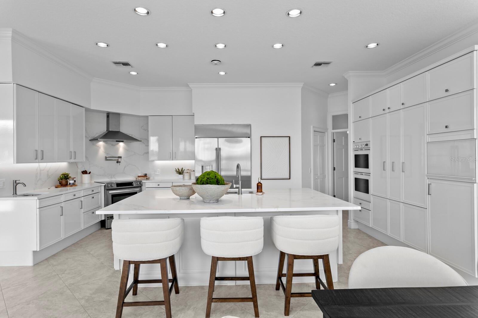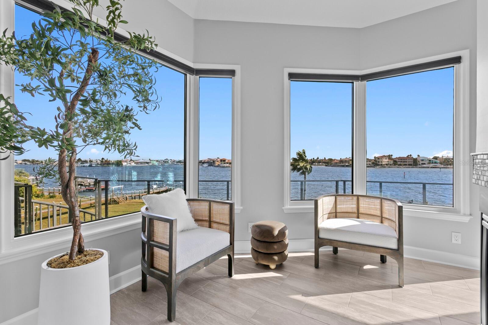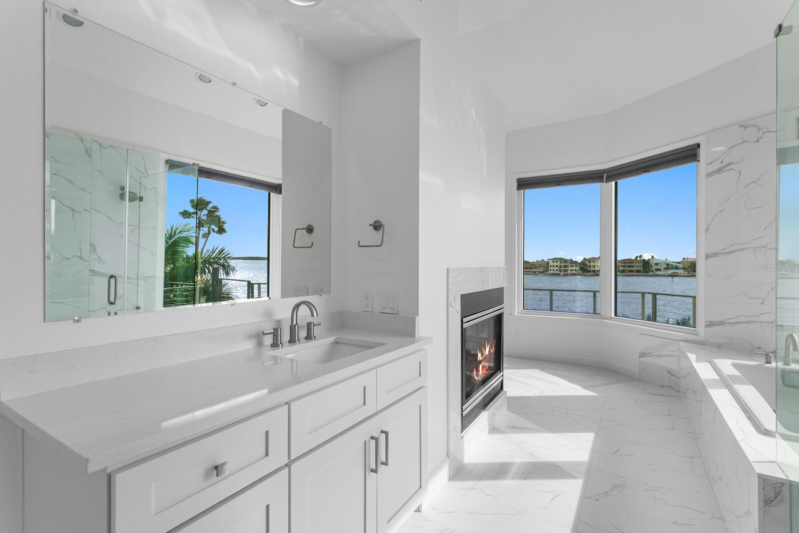 Majestic Andalucia Bayfront Estate. Poised on open sailboat water, this extraordinary waterfront estate captures sweeping, unobstructed bay views and breathtaking sunsets. Set on a double lot with 177 feet of bay frontage, the property offers exceptional privacy within the guard-gated community of Andalucia. Delivering coastal elegance and grand design, the residence is ideal for refined entertaining indoors and out. A circular paver driveway and elegant covered portico create a striking arrival, setting the tone for the home's refined coastal design. Beautifully curated finishes and expansive outdoor living spaces flow effortlessly to the shoreline. The welcoming great room showcases panoramic bay views and a gas fireplace, with French door access to the covered bayfront terrace. A chef's kitchen features a center island, breakfast bar, and breakfast area overlooking the bay, complemented by premium Miele, KitchenAid, and GE Monogram appliances, pot filler, and prep sink. Additional first floor living spaces include a light-filled office, formal dining room, expansive laundry room, full bath, and powder room. Outdoors, a true resort-style experience awaits with a saltwater pool and spa, generous pool deck, and dramatic fire feature. A stainless-steel outdoor kitchen and cabana deliver exceptional poolside entertaining with a dining bar and stone finishes overlooking the bay. The second-level primary retreat features an expansive terrace with open water views, a dual-sided gas fireplace, dual closets, and a luxurious bath with a glass-enclosed shower. Three additional ensuite guest bedrooms complete the second level, two with access to the bayfront terrace, and walk-in closets. Updates include interior and exterior paint, new carpeting, four recently added HVAC units, quartz countertops, updated interior lighting, and comprehensive landscape enhancements. Additional appointments include a Tesla Solar Powerwall, a four-car garage with convenient through-access and additional storage, and a glass three-stop elevator. Residents enjoy access to a bayfront clubhouse, community pool, lighted tennis courts, bayfront common areas, and playground. This residence includes a designated boat slip in the Andalucia Yacht Club in the community that a buyer may assume, offering a true boating lifestyle with convenient access to Tampa Bay and surrounding coastal destinations.
