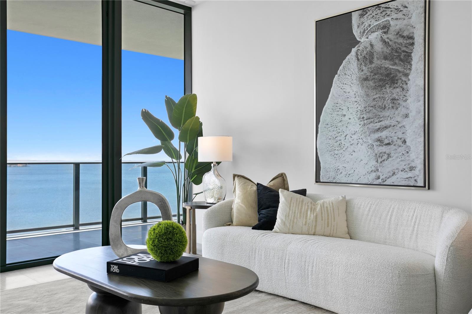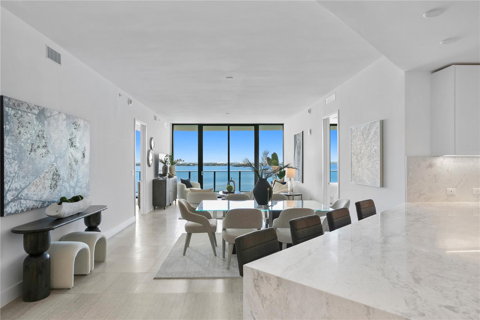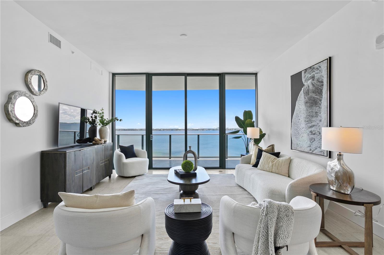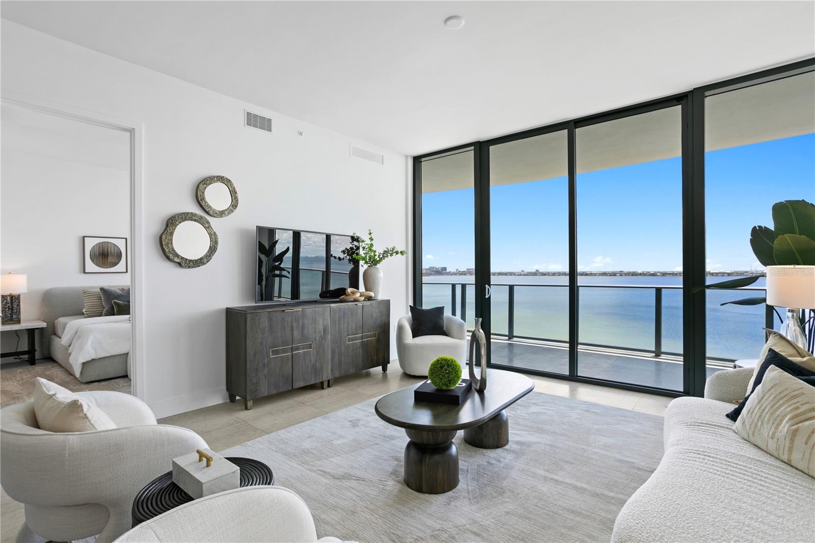 Enjoy the epitome of resort-style living at the renowned The Ritz-Carlton Residences, Tampa where every thoughtfully designed detail exudes the unmistakable essence of Ritz-Carlton luxury. Upon arrival at your private elevator lobby, you are instantly immersed into a world of meticulous detail and refined elegance in this luxury 2 bedroom, plus den condo. Boasting dazzling water views and the Tampa city skyline from the floor-to-ceiling windows and the oversized balcony overlooking iconic Bayshore Boulevard. Abundant natural light and honed marble flooring throughout provide a luxurious and serene living environment. The light and bright gourmet kitchen is equipped with top-of-the-line Sub-Zero and Wolf appliances, seamlessly integrated with bespoke marble waterfall countertops and elegant custom Italian cabinetry by Italkraft. The large primary bedroom leads to an oversized closet space and an opulent marble clad spa-inspired bath with a soaking tub. The den offers flex space for an office or 3rd bedroom. The oversized laundry room features full-size, top-of-the-line washers and dryers for utmost comfort and convenience, plus an abundance of storage space. The Ritz-Carlton resort lifestyle provides a tropical pool terrace with food and beverage options, state-of-the-art fitness center, spa services, a designated playroom, media lounge and golf simulator, pickleball and tennis courts, along with valet parking. A dedicated concierge is available to assist with personalized services, along with a 24/7 door attendant. Take a waterfront stroll along Bayshore Boulevard, known as one of the longest continuous sidewalks in the United States. Located near great shopping and restaurants, exhilarating nightlife and A-rated schools. Enjoy all the South Tampa lifestyle has to offer including walking and biking, an intrinsic art scene, sports venues, and the ease of access to airports and a vibrant downtown. Furnishings available for purchase from Dwell Market Staging at additional cost.