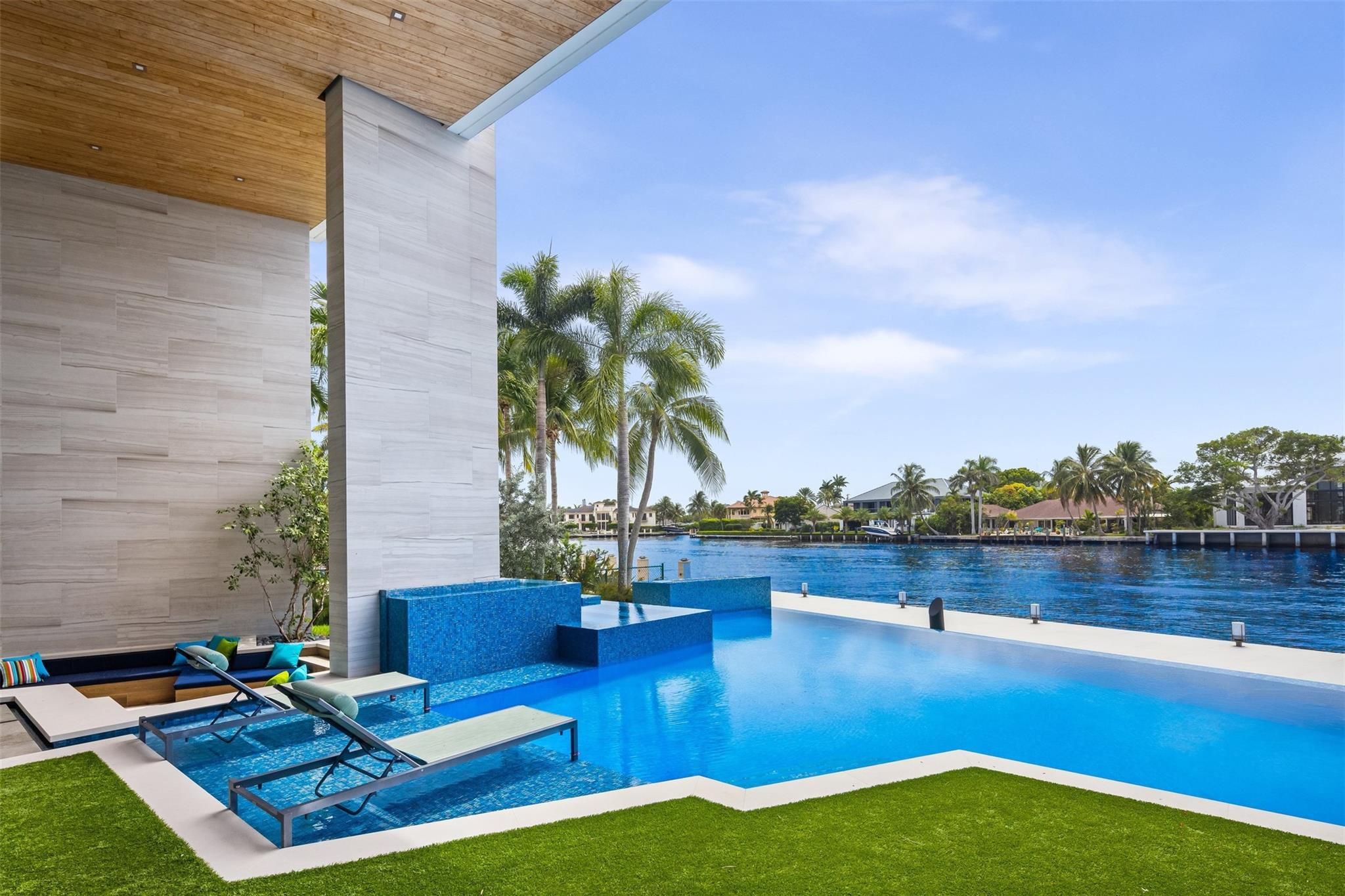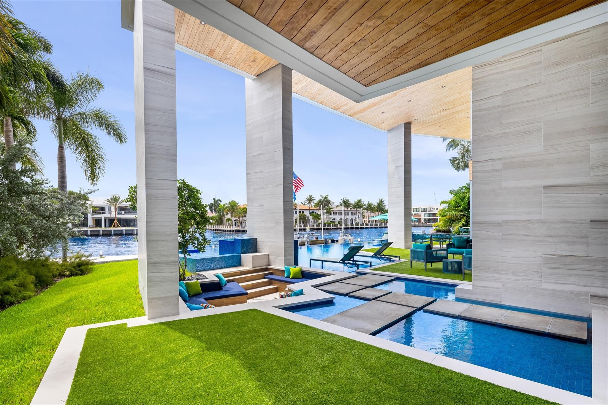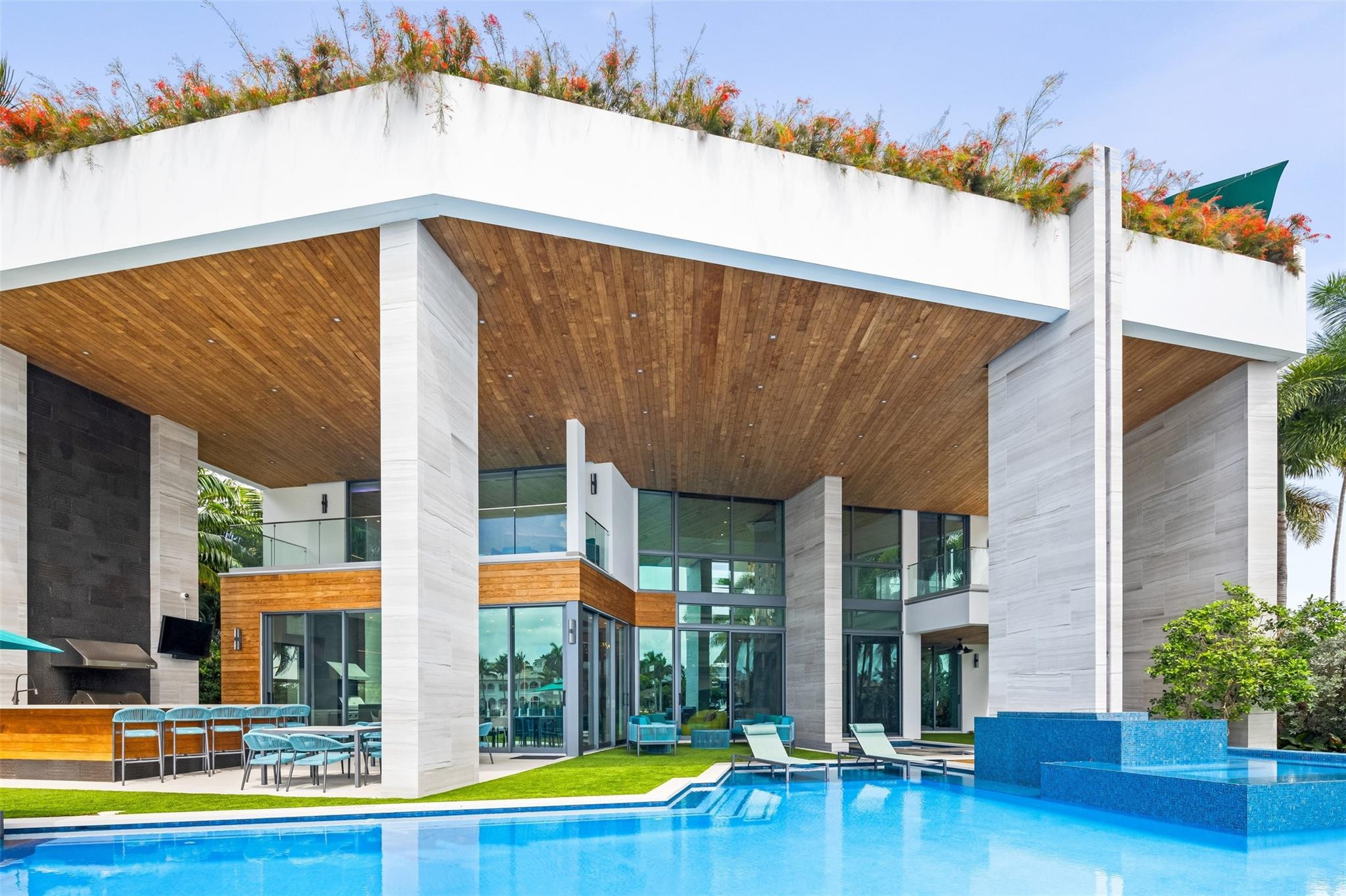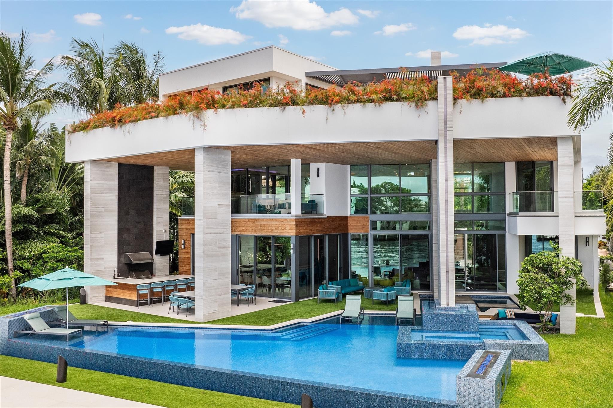 Step into luxury at this new, contemporary waterfront estate located in the secure & sought after Sea Ranch Lakes. Enter through a custom 10-foot front pivot door, find a three-story Floating Glass and Wood staircase, great room w soaring ceilings & book-matched Marble fireplace, 280-bottle temp controlled wine room & office. Chef's kitchen features double book-matched granite islands w hidden Butler's pantry. Upstairs, find 3 guest suites w Italian closets, lounge area w bar & two large terraces. Third floor is dedicated to the Primary suite w lounge area, gym, fireplace, expansive bath w Italian marble & his/hers closets, roof deck w over 1600SF & 360 degree views. Meticulously designed outdoor w summer kitchen, infinity edge pool w spa, 60K boat lift & 113' direct Intracoastal frontage.