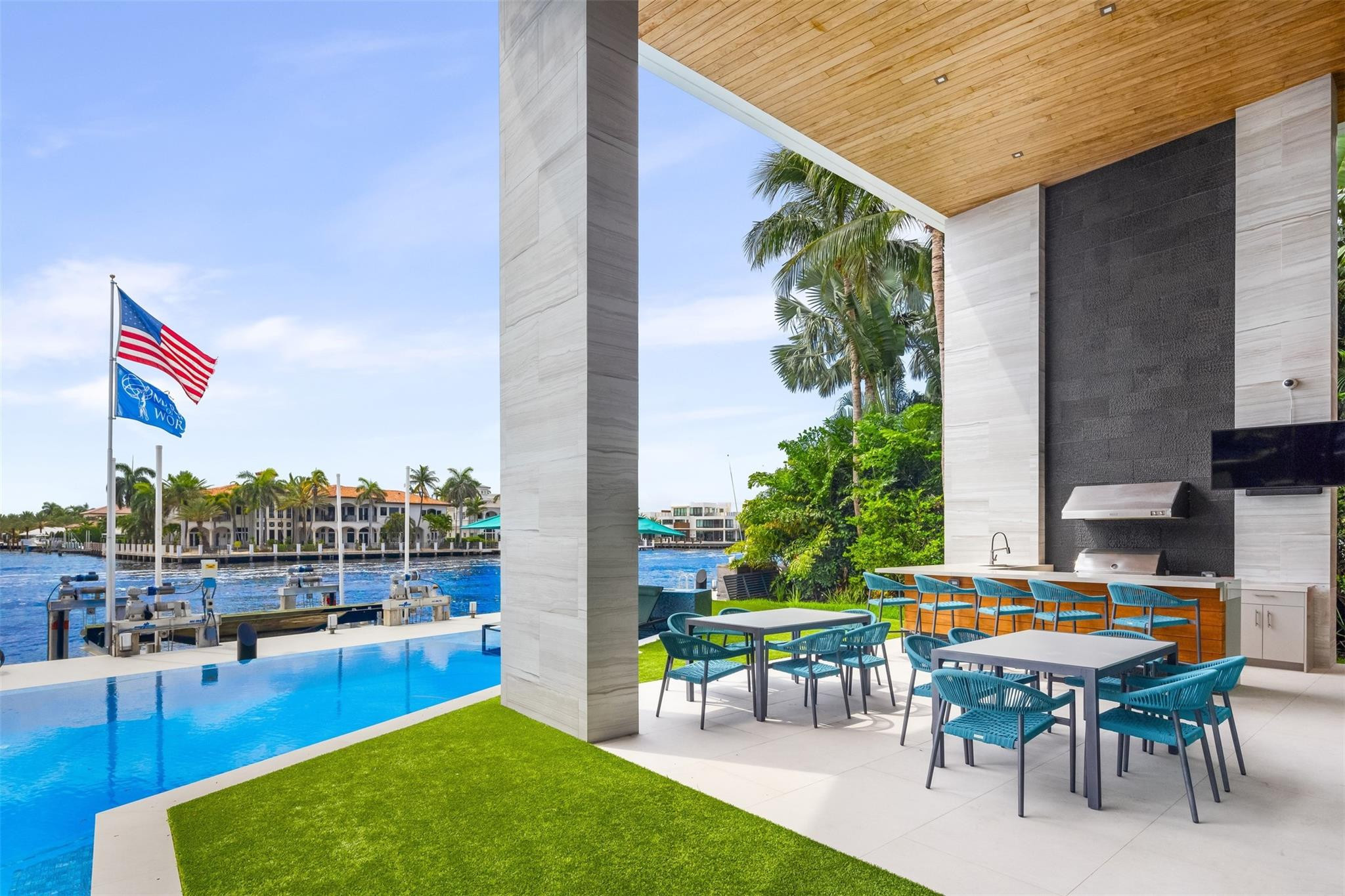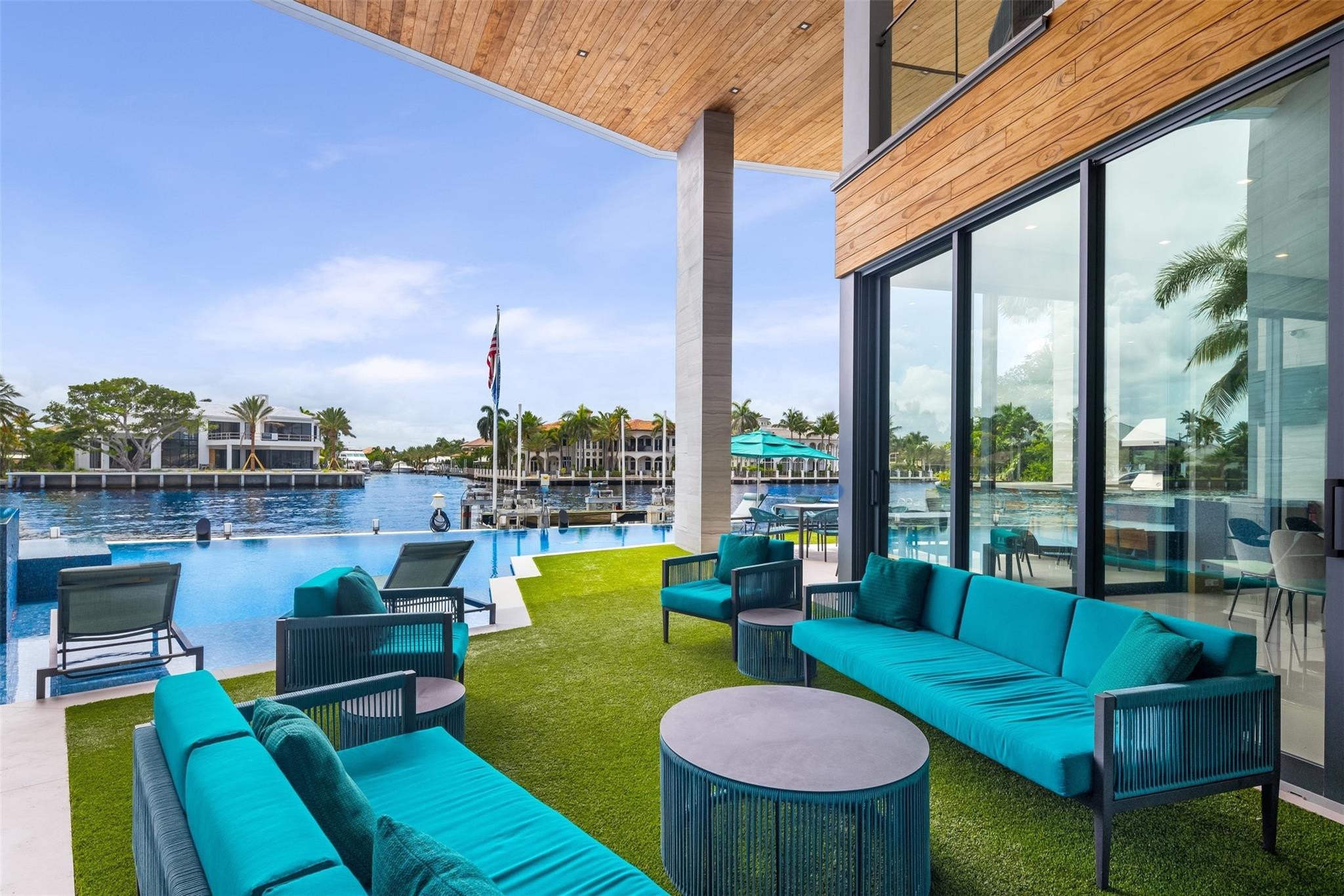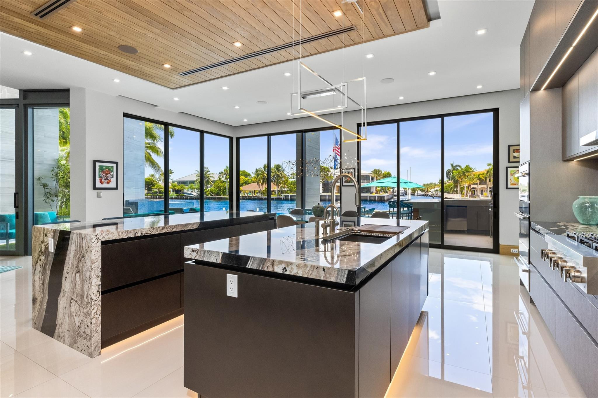 Step into luxury at this new, contemporary waterfront estate located in the secure & sought after Sea Ranch Lakes. Enter through a custom 10-foot front pivot door, find a three-story Floating Glass and Wood staircase, great room w soaring ceilings & book-matched Marble fireplace, 280-bottle temp controlled wine room & office. Chef's kitchen features double book-matched granite islands w hidden Butler's pantry. Upstairs, find 3 guest suites w Italian closets, lounge area w bar & two large terraces. Third floor is dedicated to the Primary suite w lounge area, gym, fireplace, expansive bath w Italian marble & his/hers closets, roof deck w over 1600SF & 360 degree views. Meticulously designed outdoor w summer kitchen, infinity edge pool w spa, 60K boat lift & 113' direct Intracoastal frontage.