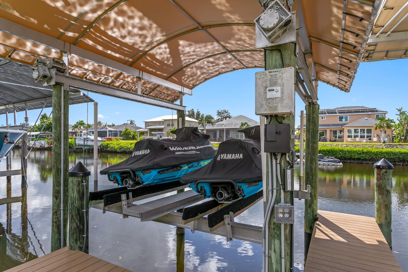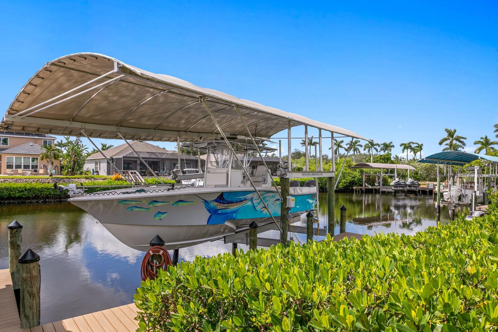 16,000 lb boat lift on the protected canal, which provides added protection from wake and waves. Kayak, fish, and enjoy endless water activities with accomodations for vessels including larger boats, yachts and jet skis (buyer to verify dimensions and regulations). This spacious residence is distinguished by its elevated finishes, tray ceilings, flute-less fireplace, and oversized crown molding. Recent upgrades include a newly installed roof with transferable warranty, hurricane-rated slider, new interior and exterior paint, new HVAC systems, and new lighting, along with a new pool enclosure with clear-view screens and new pool/spa heaters--delivering elevated aesthetics and coveted peace of mind. Additional appointments include a three-car garage, Juliet balconies, manicured grounds, and lush landscaping.