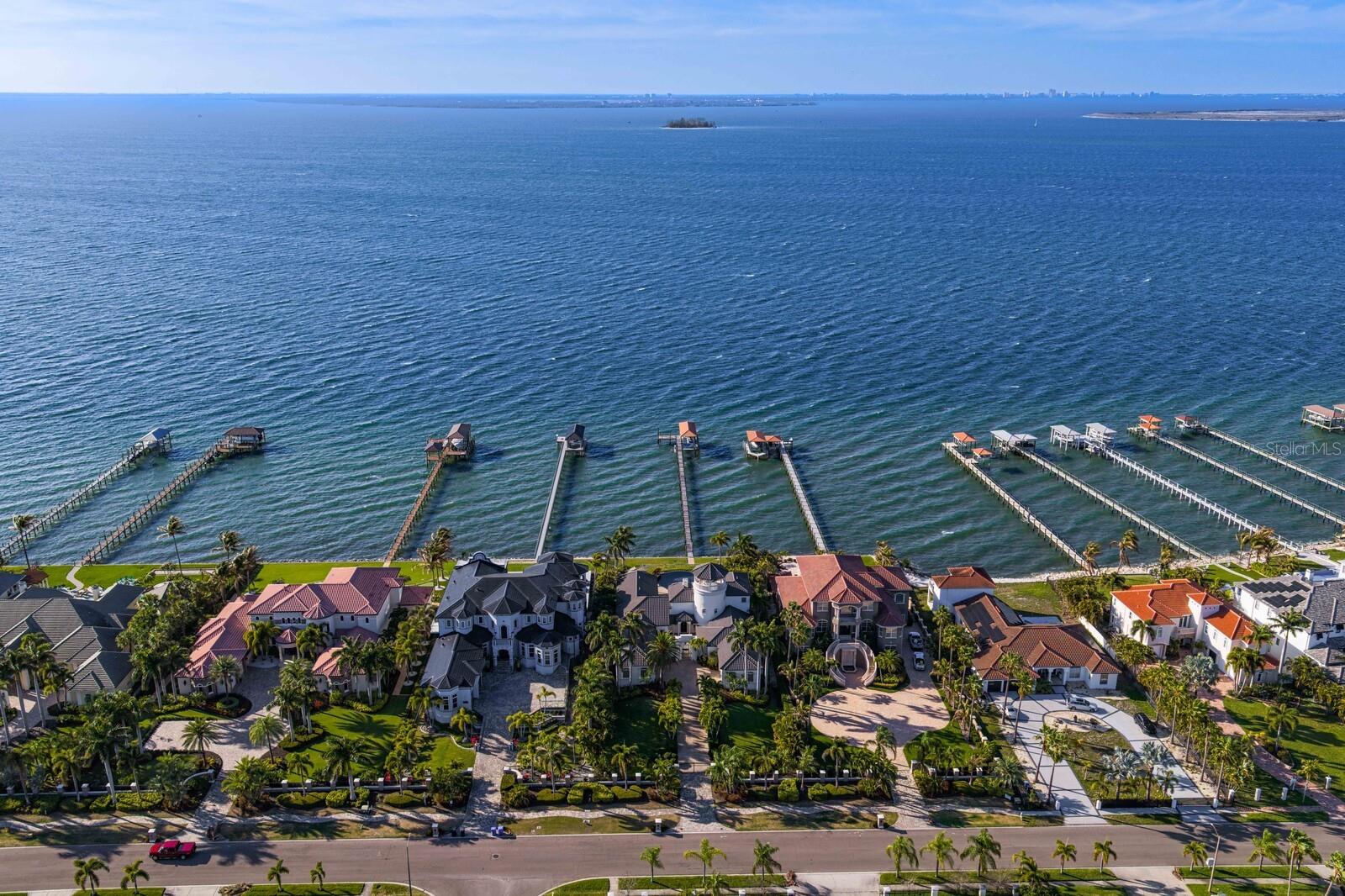 Exquisite Waterfront Estate in the private-gated estate enclave of Mustique Bay, offering refined indoor and outdoor living with multiple waterfront terraces, stunning bay views, and unforgettable western sunsets. Set on an Open Bay 0.7 acre mol waterfront lot with 100 ft of Tampa Bay frontage, enjoy endless days on the water from a dock complete with covered 13,000lb boat lift, double 6,000lb PWC lift as well as an additional uncovered PWC/Kayak lift. A gated entry and palm-lined drive create a gracious arrival to a residence that showcases timeless Mediterranean architecture, travertine flooring, and elegant architectural detailing throughout. A charming courtyard with a koi pond, framed by wrought iron gates, guides you to interiors defined by soaring ceilings and walls of glass that capture expansive water views. Mediterranean columns, a formal dining room, climate-controlled wine cellar, and a sweeping staircase enhance the home's architectural presence, while a dual-sided fireplace anchors the main living area with warmth and sophistication. The expansive chef's kitchen is thoughtfully appointed with a Viking professional gas range, stainless steel appliances, a generous island with prep sink and drawer fridge, concealed walk-in pantry, extended breakfast bar, and a wet bar with wine fridge for effortless entertaining. The kitchen flows seamlessly into the breakfast area and family room with retractable doors, all positioned to embrace the waterfront setting. A luxurious primary retreat welcomes you with Bay views and French door access to the pool, dual closets and an exceptional bath that includes a steam shower, dry sauna, and spa tub with courtyard views through a retractable, furniture quality roll-up door. Additional living spaces include an executive den/office with water views and fireplace, along with a first-floor ensuite guest bedroom, laundry room and pool bath. Upstairs, an additional ensuite guest bedroom offers French door access to a private multi-level terrace with water views, along with access to a third level outdoor tower entertaining terrace that features 360-degree views taking in St. Petersburg, South Tampa and Downtown Tampa. Spectacular Florida waterfront living awaits outdoors with a covered lanai, outdoor kitchen, and outdoor fireplace that overlooks a stunning resort-style infinity pool with multi-waterfalls and majestic Bay beyond. Additional appointments include a backup generator, water softener system, smart security and gate system, Anderson doors/windows, surround sound, fortified seawall, and 4 car garage spaces with spare utility space. Immerse yourself in magnificent waterfront living and embrace all that Apollo Beach has in this popular waterfront community. Featuring an abundance of recreation on and off the water, a central location provides easy access to beaches, shopping, dining, parks, Tampa, St. Petersburg and Sarasota.
