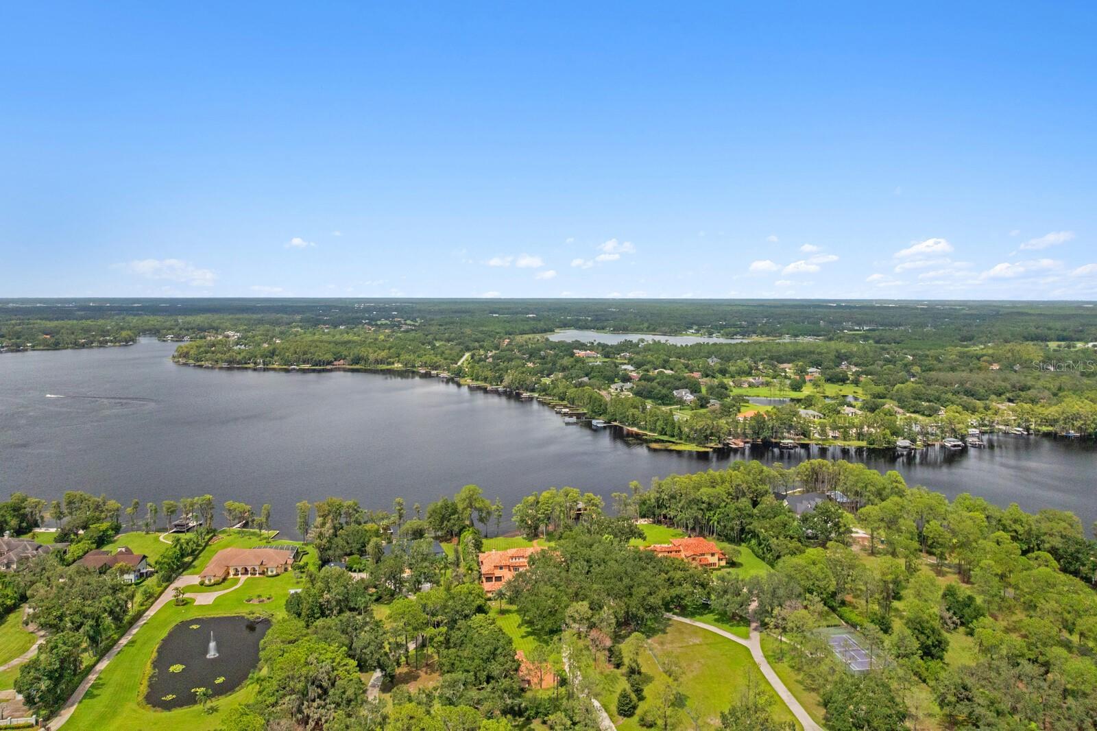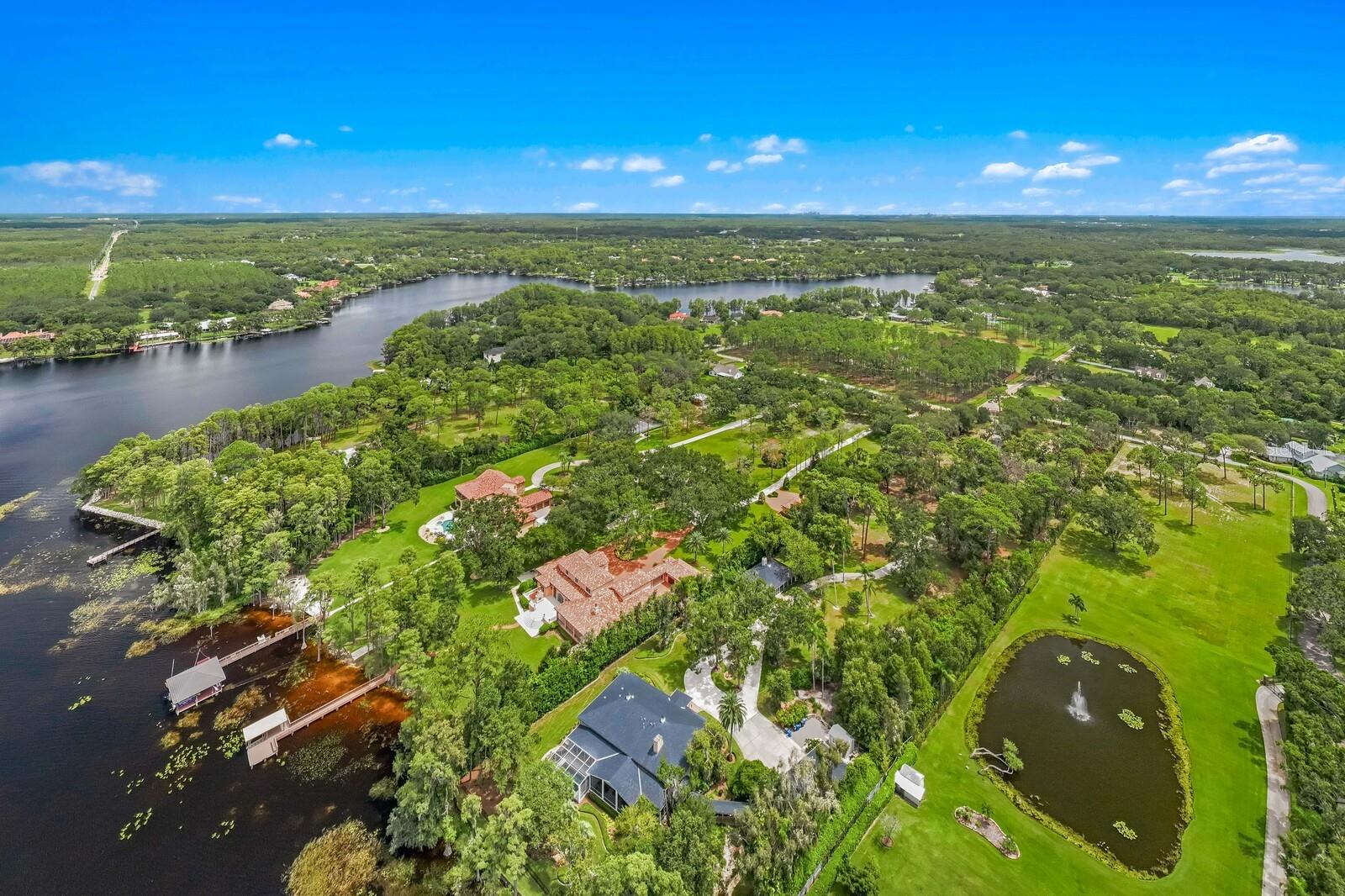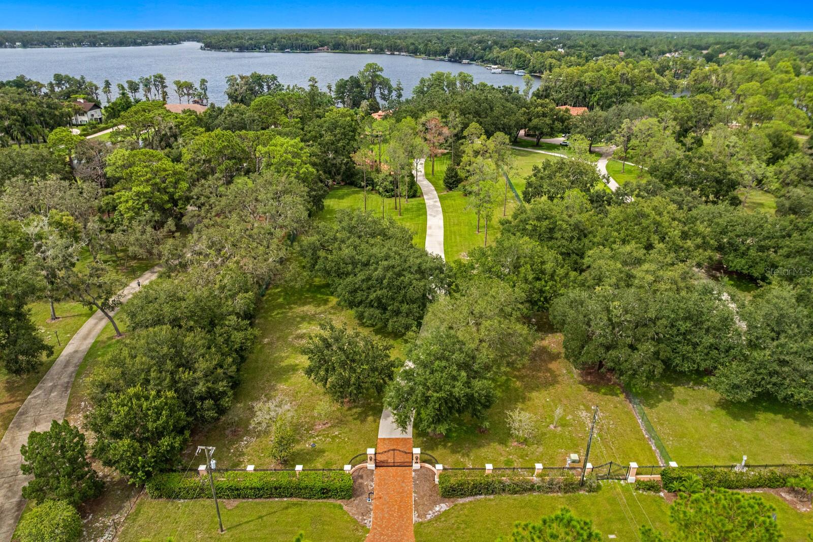 Nestled along the tranquil shores of Lake Keystone, this exceptional gated estate offers a blend of timeless architecture, refined appointments and coveted lakeside living. Offering 180 feet of pristine lake frontage and a sprawling 4.35-acres, this manicured property delivers privacy and serenity. Built by Fechtel Homes, classic architectural design provides elegant details throughout, with wood-beamed coffered ceiling, warm wood accents and stunning lake views. Light filled living spaces on the first level are accompanied by soaring 11+ foot ceilings, media room, executive office/library with fireplace and formal dining room. An elegant foyer leads to the gracious living room and family room with fireplace, offering flowing spaces and lake views. A chef's kitchen will inspire elevated culinary expression with top-of-the-line appliances and granite counters, expansive center island, impressive wine refrigeration and butler's pantry. Equipped with Wolf, Sub-Zero, Bosch and Viking appliances, including the added benefit of a commercial refrigerator and 6-burner range, along with a breakfast area. The gracious first floor primary suite retreat delivers a personal sanctuary with lake views, luxurious bath and dual custom closets. Additional features on the first level include a mudroom and generous laundry room with dual washers and dryers. The second level features the private spaces with 3 additional bedrooms with en suite baths and a casita/guest suite featuring living area, kitchenette, additional bedroom, full bath, and private access, perfect for guests, extended stay or multigenerational living. Captivating Florida living welcomes you outdoors through a spacious loggia to an outdoor kitchen, expansive terrace and spa that overlook meticulously maintained grounds and tranquil lake beyond. A private composite dock is equipped with electricity and offers multiple covered entertaining areas and a boat ramp for endless access to lake adventures. Additional highlights include 3 garages accommodating up to 9 cars. The detached 5-car garage provides a climate controlled interior, plus additional storage. Embrace a superior lake lifestyle in this extraordinary estate offering architectural craftsmanship and abundant natural beauty in this Odessa community. With over 4 acres of picturesque land, the property also offers the opportunity for equestrian use -- buyer to verify all zoning and land use permissions with the county.