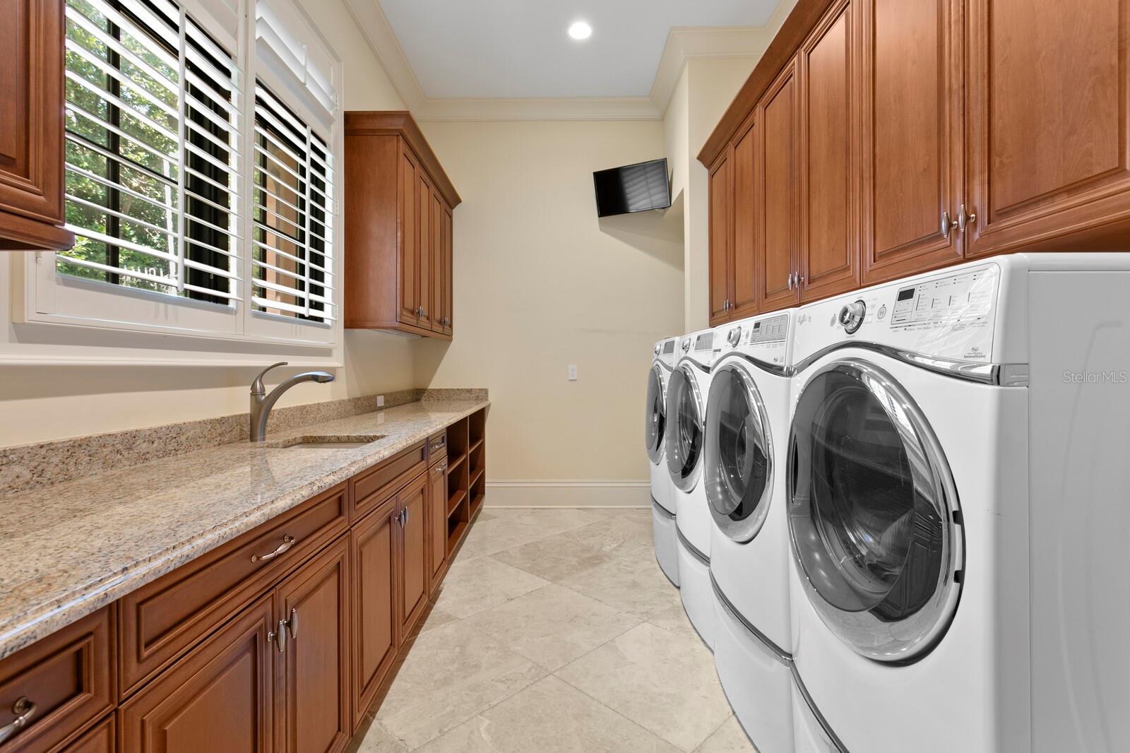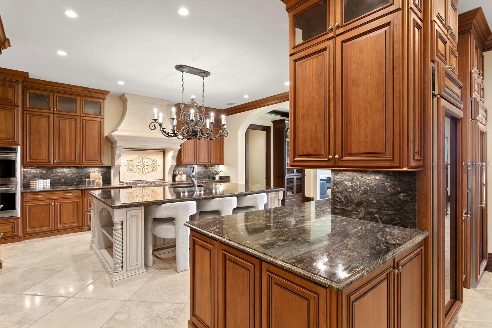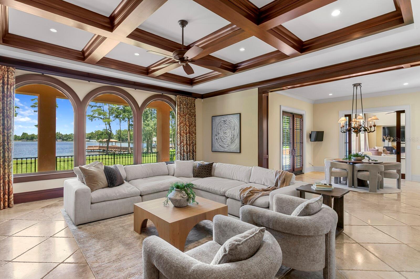 Nestled along the tranquil shores of Lake Keystone, this exceptional gated estate offers a blend of timeless architecture, refined appointments and coveted lakeside living. Offering 180 feet of pristine lake frontage and a sprawling 4.35-acres, this manicured property delivers privacy and serenity. Built by Fechtel Homes, classic architectural design provides elegant details throughout, with wood-beamed coffered ceiling, warm wood accents and stunning lake views. Light filled living spaces on the first level are accompanied by soaring 11+ foot ceilings, media room, executive office/library with fireplace and formal dining room. An elegant foyer leads to the gracious living room and family room with fireplace, offering flowing spaces and lake views. A chef's kitchen will inspire elevated culinary expression with top-of-the-line appliances and granite counters, expansive center island, impressive wine refrigeration and butler's pantry. Equipped with Wolf, Sub-Zero, Bosch and Viking appliances, including the added benefit of a commercial refrigerator and 6-burner range, along with a breakfast area. The gracious first floor primary suite retreat delivers a personal sanctuary with lake views, luxurious bath and dual custom closets. Additional features on the first level include a mudroom and generous laundry room with dual washers and dryers. The second level features the private spaces with 3 additional bedrooms with en suite baths and a casita/guest suite featuring living area, kitchenette, additional bedroom, full bath, and private access, perfect for guests, extended stay or multigenerational living. Captivating Florida living welcomes you outdoors through a spacious loggia to an outdoor kitchen, expansive terrace and spa that overlook meticulously maintained grounds and tranquil lake beyond. A private composite dock is equipped with electricity and offers multiple covered entertaining areas and a boat ramp for endless access to lake adventures. Additional highlights include 3 garages accommodating up to 9 cars. The detached 5-car garage provides a climate controlled interior, plus additional storage. Embrace a superior lake lifestyle in this extraordinary estate offering architectural craftsmanship and abundant natural beauty in this Odessa community. With over 4 acres of picturesque land, the property also offers the opportunity for equestrian use -- buyer to verify all zoning and land use permissions with the county.